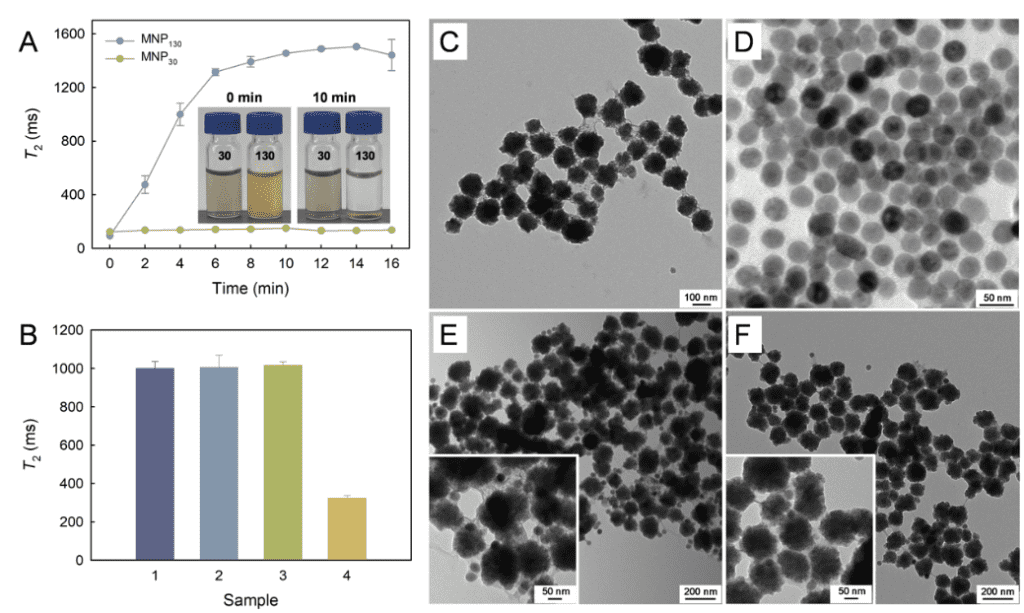 As shown in Figure 1, MNP130 and MNP30 were modified with SA and S2 on their surfaces to create the SA-modified MNP130 (MNP130-SA) and S2-modified MNP30 (MNP30-S2) probes. When the target is present, the Cas12a, crRNA, and target DNA form a ternary complex, activating the trans-cutting activity to non-specifically cut biotin-S1. As a result, MNP30-S2 cannot bind to the MNP130-SA surface through the base pairing between S1 and S2, and remains dispersed in the solution under the magnetic field. On the other hand, a large amount of MNP30-S2 binds to the MNP130-SA surface and is separated under the magnetic field. Finally, MNP30-S2 in the clear solution is used as a probe, and Salmonella is detected through the measurement of the transverse relaxation time T2.