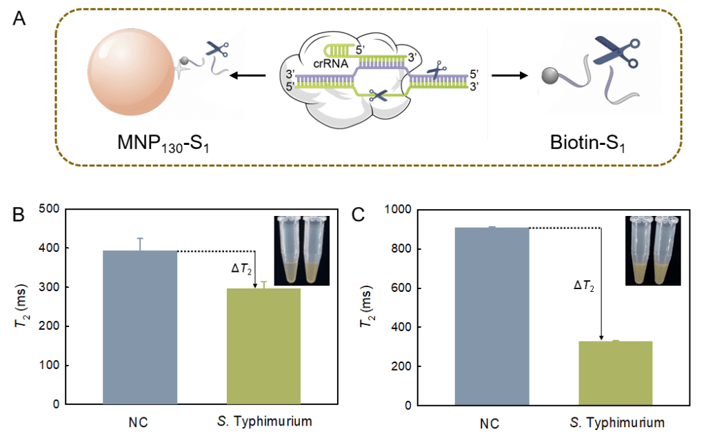 MNPs can serve as magnetic probes for MRS sensing detection. Traditional MRS biosensor methods based on MNP aggregation/disaggregation changes are susceptible to sample matrix interference and have poor stability. MRS biosensors based on MNP quantity changes have been well developed. However, these methods require the target itself to provide sites for controlling the binding between MNPs of different sizes. The limited surface sites of the target and possible non-specific binding may reduce the sensitivity of detection. Therefore, this paper combines the CRISPR-Cas12a system with MRS sensing technology, using CRISPR-Cas12a to precisely control the binding of two different-sized MNPs, and develops a CRISPR-Cas12a-based MRS biosensor for detecting Salmonella.