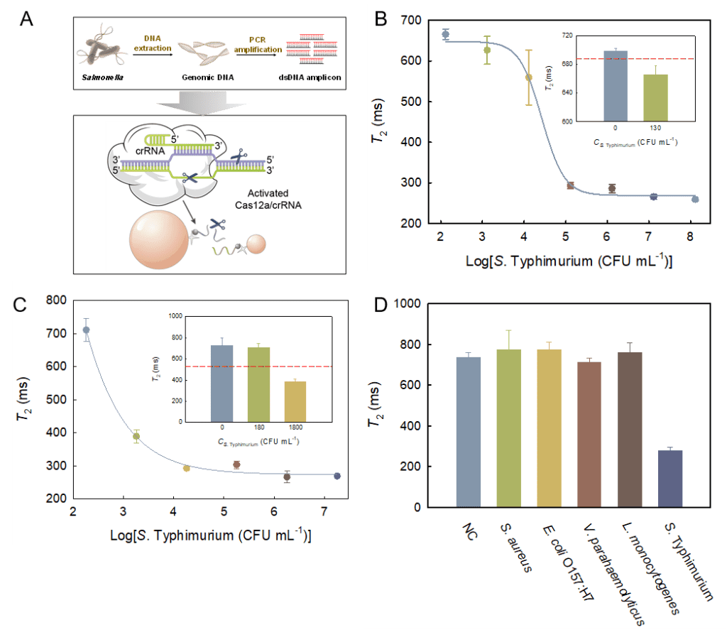This study presents a CRISPR-Cas12a-based MRS biosensor for detecting Salmonella. The method uses the CRISPR-Cas12a system to control the binding of two different-sized MNPs, with free small-sized MNPs serving as magnetic probes for MRS signal output. The LODs for S. Typhimurium in pure bacterial liquid and spiked chicken meat extract samples are 1.3×102 CFU mL-1 and 1.8×103 CFU mL-1, respectively. This method takes full advantage of MNPs’ dual function as both magnetic separation carriers and signal labels. Furthermore, by measuring the clear solution after magnetic separation, it eliminates tedious repeated washing steps, simplifying the detection process. The method can be extended to the detection of other targets by designing specific crRNA, demonstrating its general applicability.