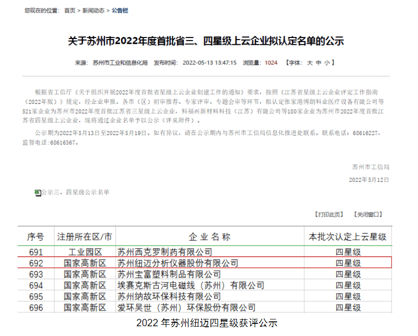 Recently, the Suzhou Municipal Bureau of Industry and Information Technology announced the first batch of “Jiangsu Province Four-Star Cloud Enterprises” for 2022, and Suzhou Newmai Analysis Instruments Co., Ltd. (hereinafter referred to as “Suzhou Newmai“) was successfully selected as a “2022 Jiangsu Province Four-Star Cloud Enterprise.”
