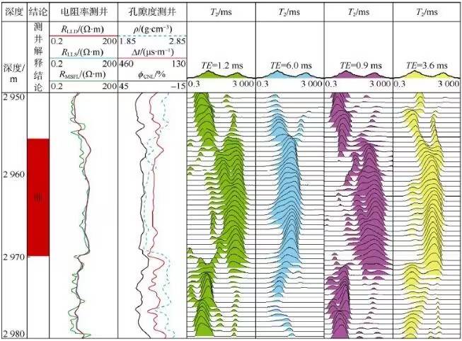 The Nanbao Depression contains various depositional facies, with rapidly changing reservoir lithology and properties, making fluid identification challenging using conventional logs. Considering the viscosity of crude oil, numerical simulation was used to select an acquisition mode: echo intervals of 0.9, 1.2, 3.6, and 6.0 ms, and a waiting time of 12.998 s. This combination allows separation of oil, gas, and water signals in the pore space.