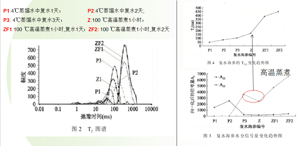 Conclusion: At a fixed temperature, as the rehydration time of sea cucumber increases (P1 to P3, ZF1 to ZF2), the free water content increases significantly. Correspondingly, the relaxation peak shifts to the right, indicating increased water mobility.