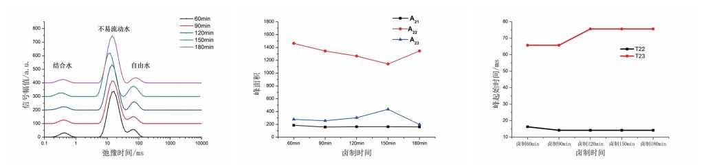 Early braising stage (60–90 min): High temperatures disrupt the protein structure, causing water to migrate from inside the myofibrils to the extracellular space. Immobile water decreases while free water increases. Heat-induced contraction of muscle fibers strengthens the binding of intracellular water, reducing T22 mobility. Simultaneously, damage to the protein matrix decreases water-holding capacity and increases T23 mobility. Some bound water is released due to thermal effects, lowering its content.