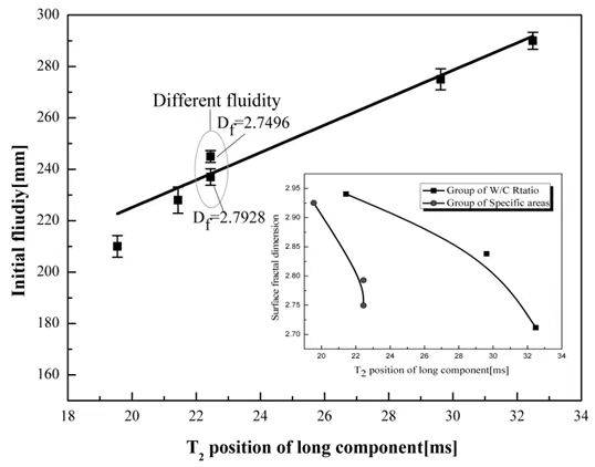 Figure 5. Relationship between initial fluidity and internal structure of cement paste