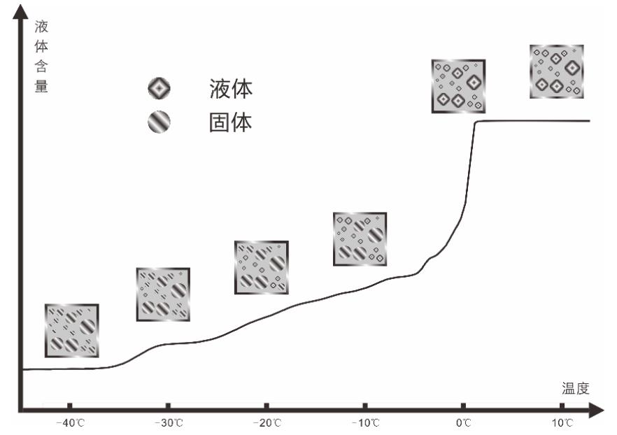 The diagram illustrates the phase transition of confined fluid in porous media. As temperature rises, liquid (typically water) melts progressively from smaller to larger pores. The total liquid volume increases. According to the Gibbs–Thomson equation, this temperature-dependent liquid increase corresponds to cumulative pore volume from smallest to largest. Accurate measurement of the liquid volume during the temperature change yields the pore size distribution.