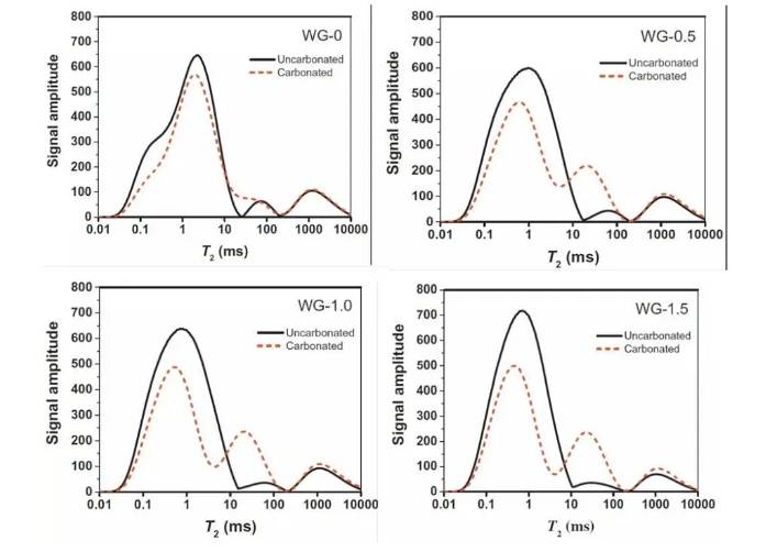 Figure 7. T2 spectra of AAS specimens before and after carbonation at various concentrations
