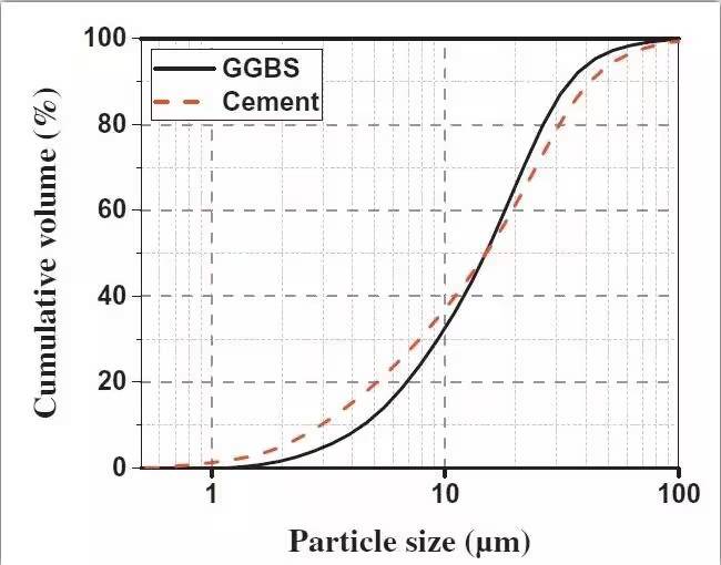 Figure 1. Particle size distribution curve of cement and alkali-activated slag