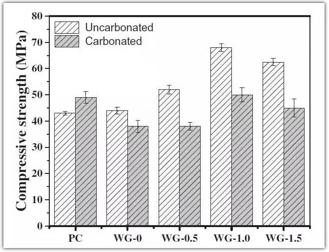 As shown in the figure, carbonation slightly improves the compressive strength of PC mortars. This is mainly due to secondary reactions between carbonation products and hydration products, forming fine crystals that fill internal pores, densify the matrix, and enhance strength.