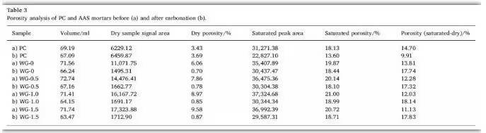 This study examined the influence of carbonation on porosity, dry-state NMR signal, and volumetric change in AAS and PC samples using LF-NMR. Results are shown in Table 3 below.