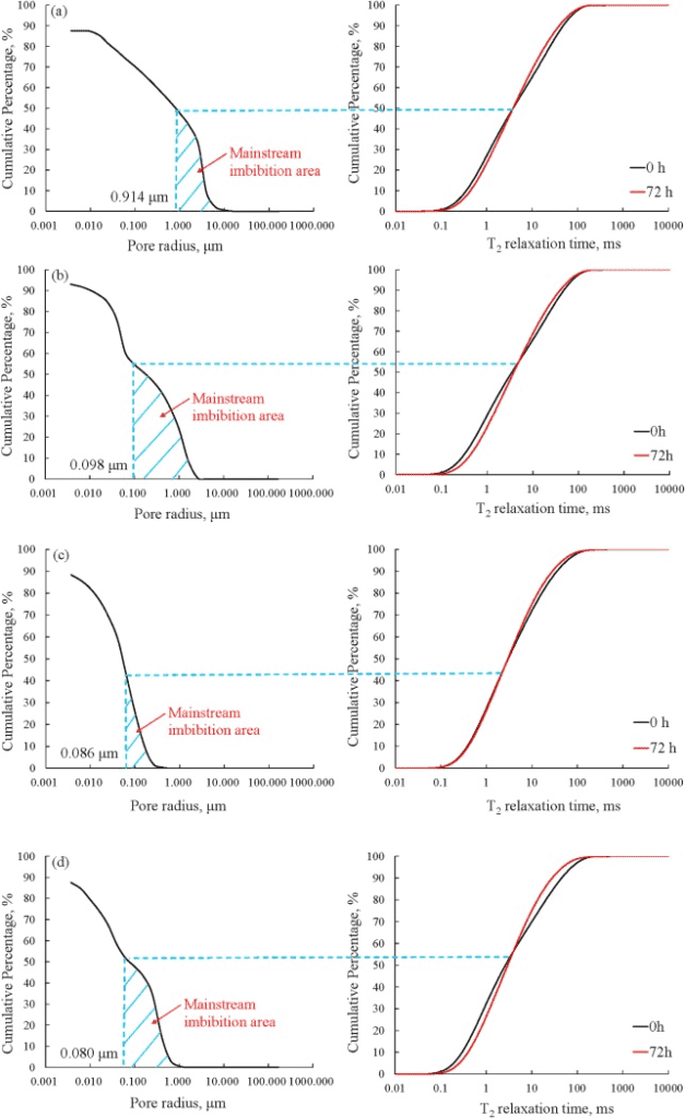All four samples were dried at 120°C for 72 hours, then saturated in kerosene at 20 MPa pressure for 12 hours. After saturation, they were wiped, weighed, and immersed in a 40% KCl solution to suppress water signals. T2 spectra were recorded at 0, 4, 8, 18, 48, and 72 hours. NMR measurements were conducted using equipment provided by Suzhou Niumag Analytical Instruments Co., Ltd. Parameters: echo spacing = 0.2 ms, wait time = 6 s, number of scans = 64.