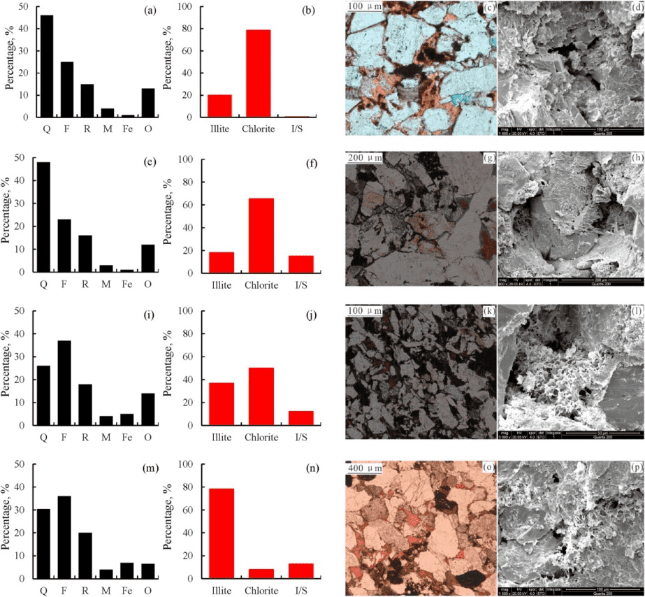 Figure 1: Mineral Composition (Column 1: TS-based mineral composition; Column 2: Clay minerals from XRD; Column 3: TS observation; Column 4: SEM images. Q: Quartz; F: Feldspar; R: Rock fragments; M: Mica; Fe: Ferrocalcite; O: Others)