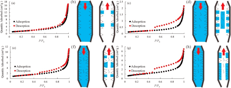 Figure 2 presents the nitrogen adsorption/desorption isotherms for all samples. Notably, samples rich in illite and I/S mixed layers with smaller pore sizes tend to constrain nitrogen more effectively.
