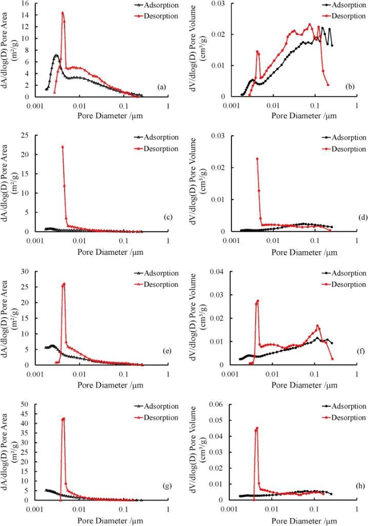 Figure 3: Pore area and volume distributions from nitrogen adsorption. X1: a–b, X2: c–d, X3: e–f, X4: g–h