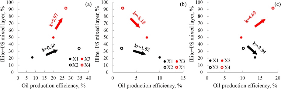 Figure 4: Fitting of hydrophilic clay minerals and oil recovery efficiency. (a) Early stage; (b) Middle stage; (c) Late stage. k: slope.