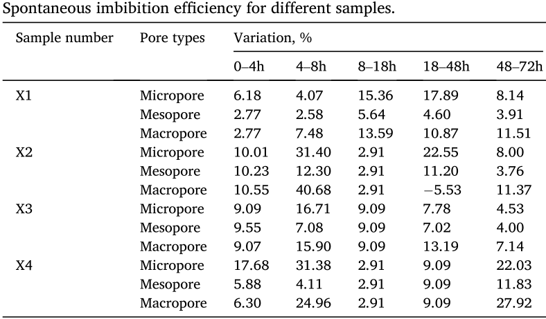 Table 3: Spontaneous imbibition efficiency of different samples