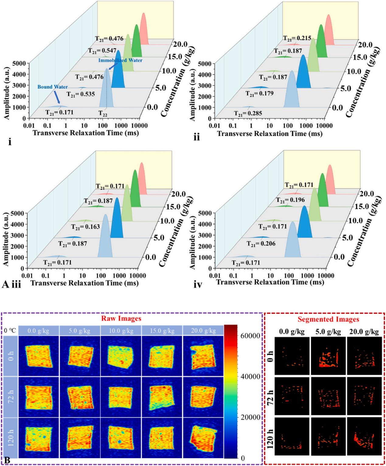 The research employed the CPMG pulse sequence to acquire transverse relaxation time (T2) data. Inversion algorithms were then applied to analyze the signals, obtaining dynamic evolution information of different water fractions during the freezing process. Furthermore, MRI imaging results, along with their threshold-segmented images, visualized the spatial distribution of water within the fish balls.