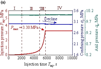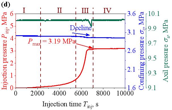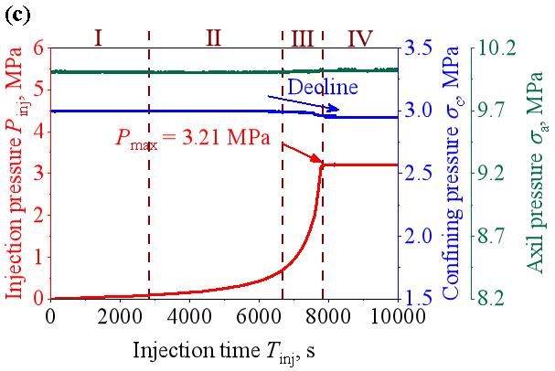 Figure 4 presents statistical plots of water injection pressure (P~inj~), axial pressure (σ~a~), and confining pressure (σ~c~) over time during water injection. It should be noted that only the pressurization stages were considered, while the periods for T₂ and MRI measurements were excluded. Overall, regardless of the α value, the water injection process can be divided into four typical stages: Slow Pressurization Stage (Ⅰ), Stable Pressurization Stage (Ⅱ), Rapid Pressurization Stage (Ⅲ), and Constant Pressure Stage (Ⅳ). The injection pressure curve shows a gradual increase during the Slow Pressurization Stage, with no significant pressure increase; subsequently, the injection pressure continues to increase steadily, then accelerates rapidly, and finally stabilizes at a maximum value. Taking α = 0° (Specimen #1) as an example, during the Slow Pressurization Stage (Ⅰ), the injection pressure increased slowly, taking 2041 seconds to rise from 0 to 0.10 MPa. This slow pressure accumulation corresponds to the initial filling of the pre-existing fracture space with water. As water injection continued, the rate of injection pressure increase accelerated significantly, taking 3199 seconds to increase from 0.10 MPa to 0.70 MPa. Upon reaching the critical threshold of 0.70 MPa, the pressure surged rapidly to 3.30 MPa. Thereafter, the injection pressure remained essentially constant. The water infiltration rate inside the specimen became comparable to the water injection rate; therefore, despite continuous water injection, the injection pressure stabilized at 3.30 MPa. However, the maximum injection pressures varied with different α values.