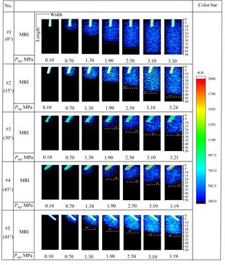 Under the same injection conditions, the infiltration zone range for the specimen with α = 0° was larger than that for specimens with other angles (15°, 30°, 45°). After the pre-existing fracture space was completely filled with water and the infiltration zone entered the stable rising stage (Stable Pressurization Stage (Ⅱ)), water preferentially infiltrated more significantly from both sides of the pre-existing fracture and expanded radially to cover nearly the entire near-surface region of the specimen (P~inj~ = 0.70 MPa). When the injection pressure reached its peak value (end of the Rapid Pressurization Stage (Ⅲ)), the fluid infiltration zone extended to the bottom of the specimen for α = 0°. For the specimen with α = 15°, the infiltration zone width at an injection pressure of 0.70 MPa was smaller than that for α = 0° under the corresponding pressure. Furthermore, unlike the α = 0° case, when the injection pressure reached its maximum, the fluid infiltration zone did not extend to the bottom of the specimen. When α increased to 30°, the infiltration zone width at 0.70 MPa decreased further. When α further increased to 45°, within the injection pressure range from 0.10 MPa to 1.90 MPa, the fluid infiltration zone width was significantly smaller compared to that at 30°.