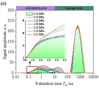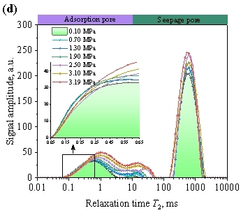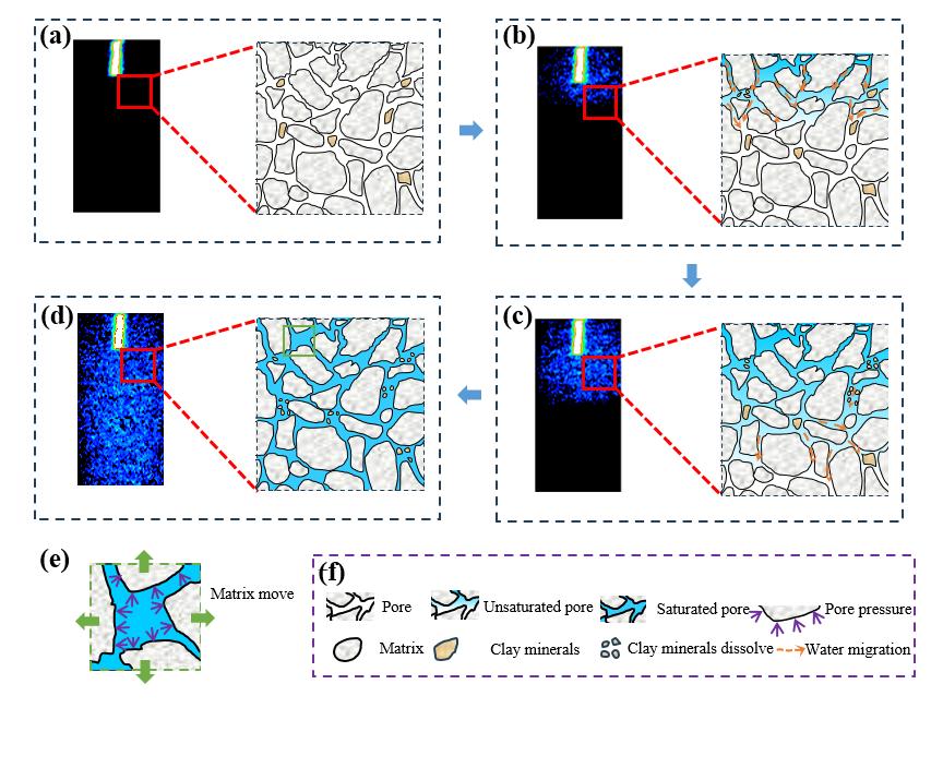 Figure 12 presents a schematic diagram of water infiltration and migration during water injection. After water enters and infiltrates the specimen, the pores within the fluid infiltration zone remain partially water-filled. As shown in Figure 8(a), during the Slow Pressurization Stage (Ⅰ), due to the low water injection pressure (P~inj~ < 0.10 MPa) and limited water infiltration, the amplitude of the T₂ curve is relatively small. As the injection pressure increases, more fluid infiltrates the specimen, and the number of filled adsorption pores and seepage pores continuously increases (see Figure 8(b)). Additionally, during the Slow Pressurization Stage (Ⅰ) and Stable Pressurization Stage (Ⅱ), due to the small infiltration volume, some micropores inside the specimen are not completely filled by infiltrating water, forming unsaturated pores (see Figure 8(c)). As the injection pressure continues to increase, more water infiltrates the specimen, promoting the gradual expansion of the infiltration zone. Previously partially filled micropores become fully saturated, and more micropores become filled with water (see Figures 8(b) to (d)). On one hand, when water infiltrates the sandstone, some minerals (montmorillonite, illite) dissolve, thereby increasing the pore sizes within the specimen. On the other hand, as the injection pressure further increases, these saturated pores are subjected to pore pressure, and the rock skeleton expands outward under the action of pore stress, leading to a slight increase in pore size (see Figures 8(d) to (e)). Furthermore, during the Rapid Pressurization Stage (Ⅲ), the rapid increase in fluid pressure not only promotes fluid infiltration but also facilitates the transformation of adsorption pores into seepage pores. Consequently, as fluid pressure increases, the proportion of adsorption pores in the specimen gradually decreases, while the proportion of seepage pores gradually increases.