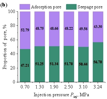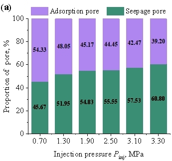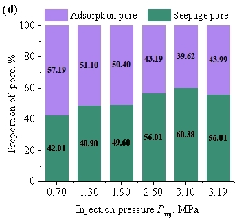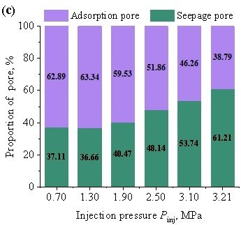 (2) Fluid infiltration promotes the transformation of pores from an unsaturated state to a saturated state. Increasing the water injection pressure can enlarge pore sizes in the saturated zone and promote the transformation of adsorption pores into seepage pores, with the proportion of adsorption pores gradually decreasing accordingly. Due to the existence of a pressure gradient within the fluid infiltration zone, the damage induced by injection pressure is primarily concentrated in the vicinity of the near-wellbore fracture.