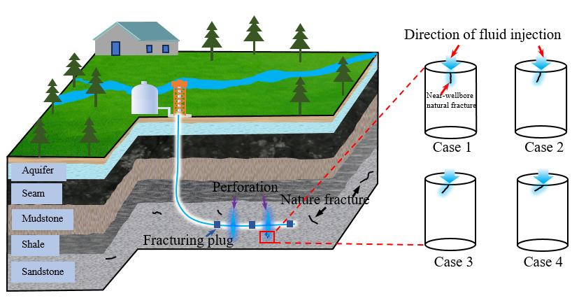 This study systematically investigates the influence of near-wellbore natural fractures on three key processes during water injection—fluid infiltration, pore water migration, and pore evolution mechanisms—using four typical scenarios illustrated in Figure 1. To achieve the research objectives, a set of specimens with pre-existing fracture angles (α) of 0°, 15°, 30°, and 45° were designed and fabricated (Figure 2(a)), followed by injection experiments. During the experiments, real-time nuclear magnetic resonance (NMR) technology was employed to monitor the evolution of T₂ curves and magnetic resonance imaging throughout the water injection process. The study comprehensively analyzes the evolution of injection pressure, fluid infiltration and migration patterns, and pore structure distribution characteristics under different dip angles of near-wellbore natural fractures. The influence of near-wellbore fracture dip angle on water infiltration behavior was investigated, revealing the mechanisms of fluid infiltration and pore damage. Based on these research findings, valuable guidance can be provided for field-scale fracturing design in tight sandstone gas reservoirs, particularly regarding the selection of fracturing intervals and optimization of injection parameters.