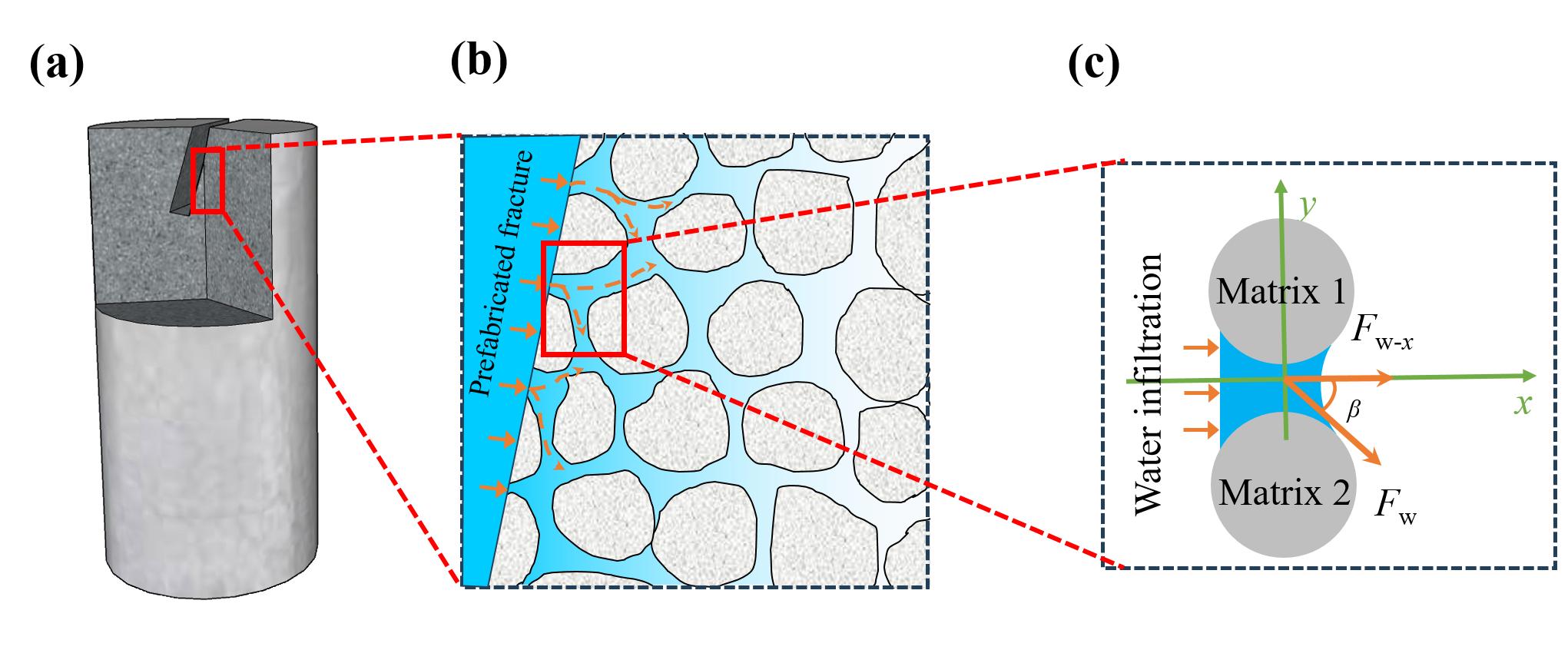To prevent water from infiltrating into the specimen from both ends of the pre-existing fracture, which could affect the experimental results, both ends of the pre-existing fracture were sealed using epoxy resin adhesive (see Figure 2(b)). Additionally, to prevent water from entering the specimen from any location other than the pre-existing fracture on the top surface during water injection, the top surface of the specimen was wrapped with waterproof tape (see Figure 2(b)). A water injection hole with a diameter of 2 mm was drilled to ensure that water could be injected into the pre-existing fracture during the experiment. Furthermore, scanning electron microscopy (SEM) images (see Figure 2(c)) reveal the presence of micropores between sandstone particles, suggesting that the complex pore structure may influence water migration behavior.