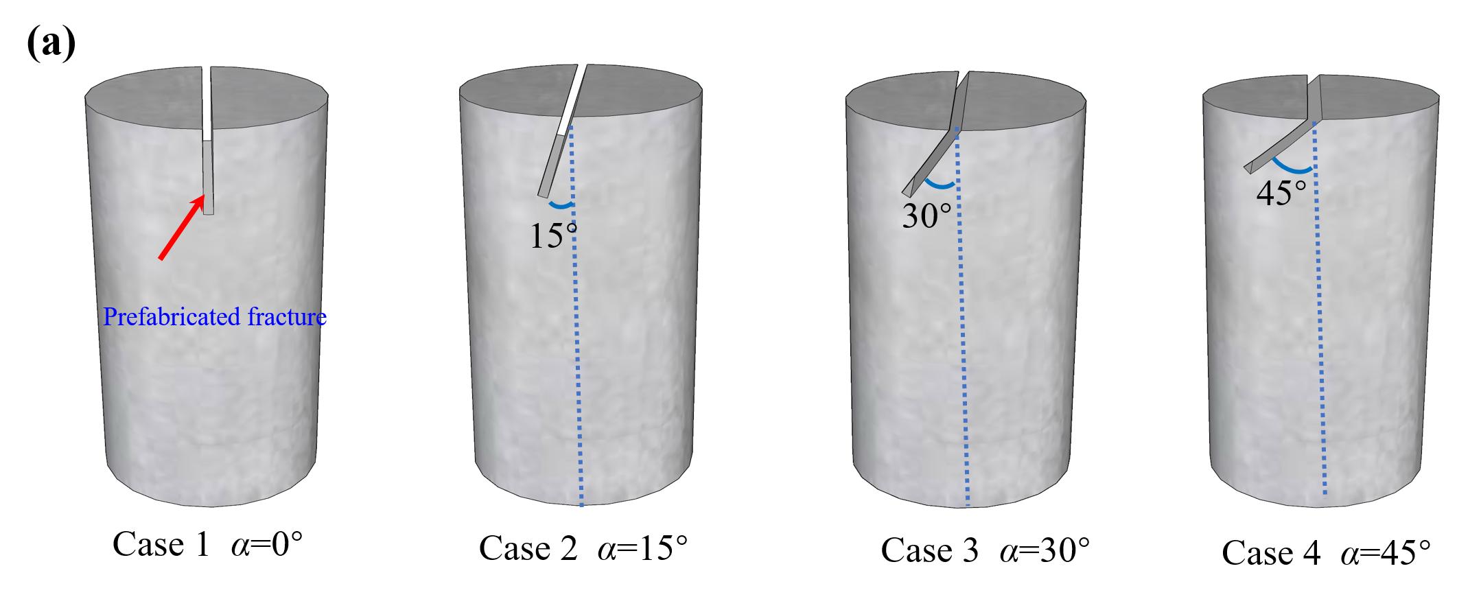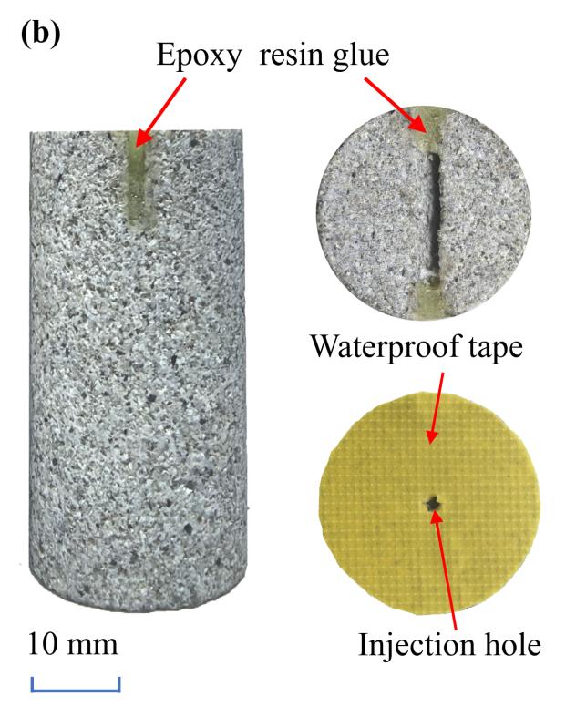Sandstone blocks were processed into cylindrical specimens with a diameter of 25 mm and a height of 50 mm for this study. To simulate the influence of near-wellbore natural fractures on the hydraulic fracturing process, a pre-existing fracture with a width of 2 mm and a length of 10 mm was precisely fabricated on the top surface of each cylindrical rock specimen. The angle between the pre-existing fracture and the specimen axis was defined as the pre-existing angle α (see Figure 2(a)). The specimen axis direction also corresponds to the water injection direction.