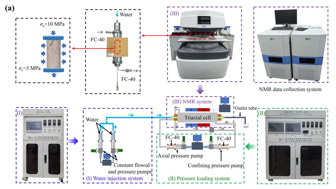 The experimental setup consisted of three components: I Water Injection System, II Pressure Loading System, and III Nuclear Magnetic Resonance System (see Figure 3(a)). The Water Injection System (I) included a computer control system and two syringe pumps. The syringe pumps could operate in either constant pressure mode or constant flow mode, providing a pressure range of 0.10–40 MPa and an injection rate range of 0.001–40 mL/min. Controlled by the computer, the two syringe pumps could automatically replenish water and switch between pumps based on remaining water volume, ensuring continuous and stable water supply, thereby avoiding experimental interruptions and maintaining consistent experimental conditions throughout the process. The Pressure Loading System (II) was used to apply controlled pressure to the specimens. In this study, the hydrogen-free (¹H) compound Fluorinert FC-40 was selected as the pressurizing medium for both axial and confining pressures. This medium was chosen because its lack of hydrogen nuclei prevents interference with the accuracy of T₂ and MRI measurements during the experiment. The Pressure Loading System (II) could apply a maximum axial pressure of 100 MPa and a maximum confining pressure of 40 MPa. The Nuclear Magnetic Resonance System (III) employed a MacroMR12-150H-I model (Suzhou Niumag Corporation, China), used to characterize pore structure and water infiltration characteristics. This system has a magnetic field strength of 0.3 T, a frequency of 12 MHz, and an operating temperature of 25–32 °C. The maximum gradient magnetic field strength is 0.15 T/m.