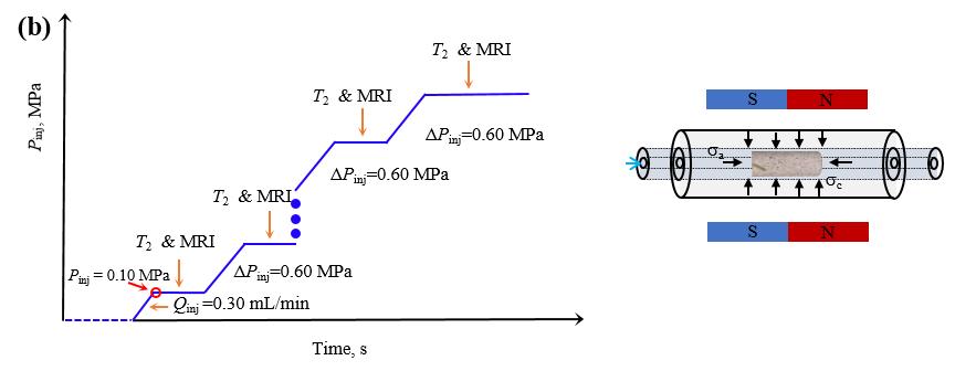 Prior to the water injection experiments, all specimens were dried in a laboratory oven at 105 °C for 24 hours to ensure complete removal of initial pore water, thereby eliminating potential interference with the experimental measurements. Subsequently, the specimens were allowed to cool naturally to ambient temperature (25 ± 2 °C) under room conditions before the water injection experiments began. The water injection experiments were conducted under precisely controlled triaxial stress conditions, with a confining pressure of 3 MPa and an axial pressure of 10 MPa. Throughout the experiments, a precision syringe pump was used to inject water at a constant injection rate of 0.30 mL/min, ensuring stable fluid delivery. The water injection procedure systematically involved two key steps: first, the system was started to thoroughly flush the pipelines, ensuring uniform drainage and expelling any air; second, the specimen was correctly connected to the system. This standardized approach effectively minimized experimental errors caused by trapped air in the injection system. When the injection pressure reached 0.10 MPa, the initial T₂ and MRI measurements were performed. Thereafter, T₂ and MRI signals were measured at injection pressure increments of 0.60 MPa, with final measurements recorded at the peak injection pressure. The detailed experimental procedure is illustrated in Figure 3(b).