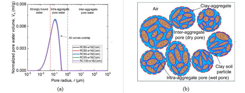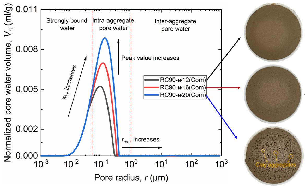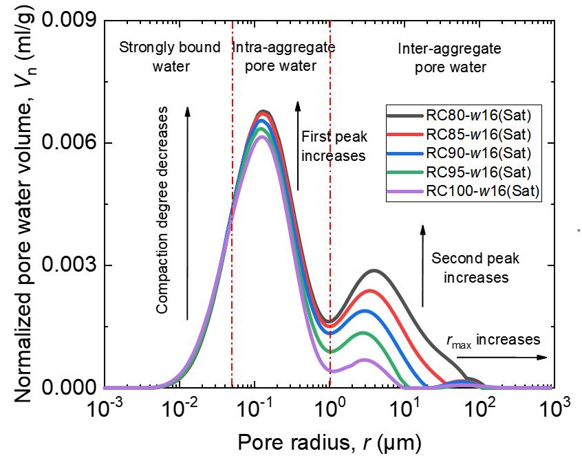 Figure 4(a) shows the pore water distribution curves for unsaturated compacted specimens prepared at optimum water content but with different compaction degrees. It can be observed from the figure that pore water in unsaturated compacted specimens is primarily stored in pores with radii ranging from 0.005 μm to 0.35 μm. The pore water types are adsorbed water and intra-aggregate pore water, while inter-aggregate pores (pore radius > 1.0 μm) are dry. This indicates that compacting the specimen at optimum water content is insufficient for inter-aggregate pores to imbibe water, as illustrated in Figure 4(b). Furthermore, because the ordinate uses normalized pore water volume (pore water volume per gram of dry soil), the pore water distribution curves for specimens under different compaction degrees almost overlap. This suggests that the compaction stress applied in this study is insufficient to alter the morphology of the pore water distribution curve for unsaturated compacted specimens.