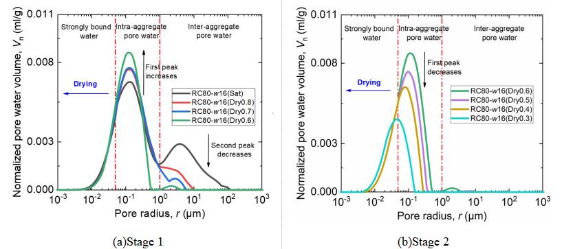(3) During soil drying, inter-aggregate pore water is rapidly expelled. The main peak intra-aggregate pore water content first increases and then decreases, while the adsorbed water content remains constant. Due to the presence of clay particles, the soil undergoes volume shrinkage during drying, causing the pore water distribution curve to shift towards smaller pore sizes.
