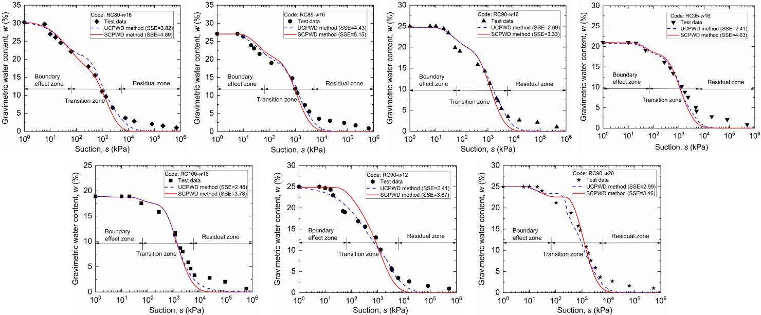 Based on measured soil-water characteristic curves of silty clay under different initial conditions, the predictive performance of the Saturated Soil Cumulative Curve Method and the Unsaturated Soil Envelope Method was compared. The normalized Sum of Squared Errors (SSE) was used to evaluate prediction accuracy, as shown in Figure 8. The comparison results indicate that both methods can reasonably predict the soil-water characteristic curves of silty clay under different initial conditions, with the Unsaturated Soil Envelope Method exhibiting higher prediction accuracy.