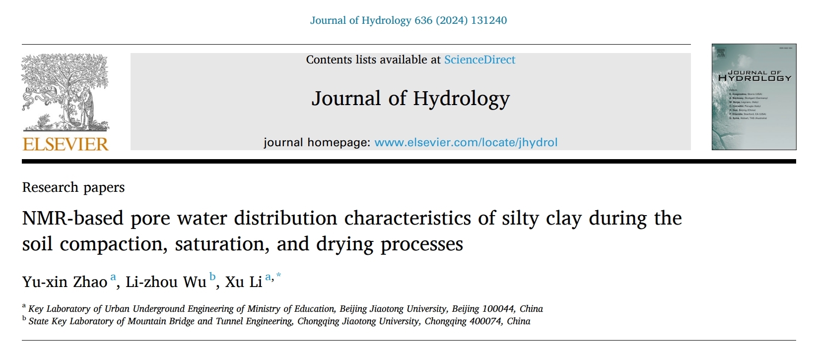 [1]Zhao, Y. X., Wu, L. Z., Li, X*. (2024). NMR-based pore water distribution characteristics of silty clay during the soil compaction, saturation, and drying processes. Journal of Hydrology, 636, 131240.