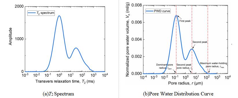 Using formulas (1) and (3), the NMR T2 spectrum (Figure 2(a)) can be converted into a pore water distribution curve (Figure 2(b)). It should be noted that since NMR technology detects hydrogen nuclei in the specimen, the pore water distribution curve of a saturated specimen is essentially the pore size distribution curve.