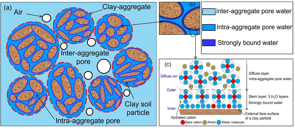 On the surface of clay particles, molecular polarity leads to the formation of an electric double layer. The electric double layer consists of the permanent negative charge on the clay mineral surface and counterions in the surrounding solution, including the Stern layer (inner layer) and the diffuse layer (outer layer), as shown in Figure 3(c). In the Stern layer, several layers of water molecules are tightly adsorbed onto the clay particle surface, forming a very thin film of water called adsorbed water. In the diffuse layer, counterions are not only influenced by electrical forces but also tend to diffuse into the external solution. The water in the diffuse layer can be classified under intra-aggregate pore water.