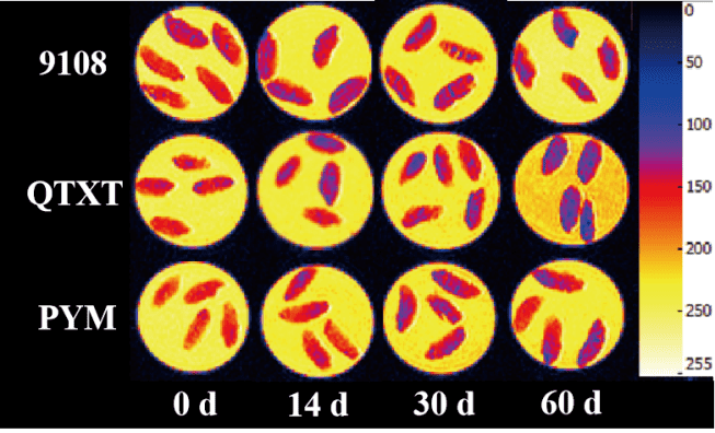 2. Moisture State Analysis: LF-NMR measured the water relaxation characteristics at each storage point to calculate proportions of different water types, particularly the change in free water content (T22). MRI was used to visualise the uniformity of water distribution.