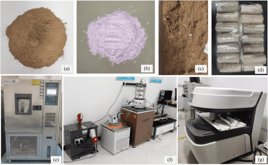 Figure 1: (a) Loess; (b) Nano-MgO; (c) NM-treated Loess; (d) Sample Specimens; (e) F-T Chamber; (f) Dynamic Triaxial Setup; (g) NMR Analyzer