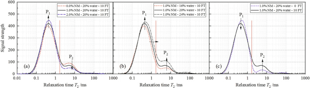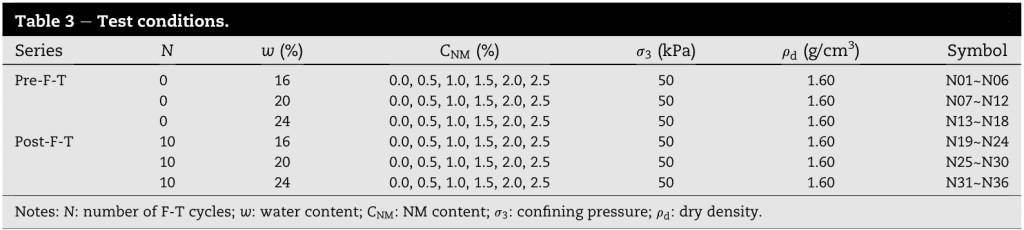 2. NMR analysis supports the mechanism behind NM’s stabilisation effect under F-T conditions. NM promotes water absorption, transforming free water into bound water. This fundamentally enhances dynamic behaviour and reduces F-T damage in loess samples.