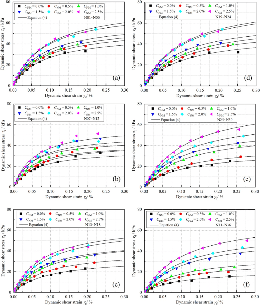 Figure 2 shows the dynamic shear strain–stress curves for samples with 0% to 2.5% NM, before and after F-T cycles. All samples exhibited strain-hardening behaviour and conformed to the Hardin model. Notably, the curves shifted upward with increasing NM content, indicating higher shear stress at equivalent strain levels.
