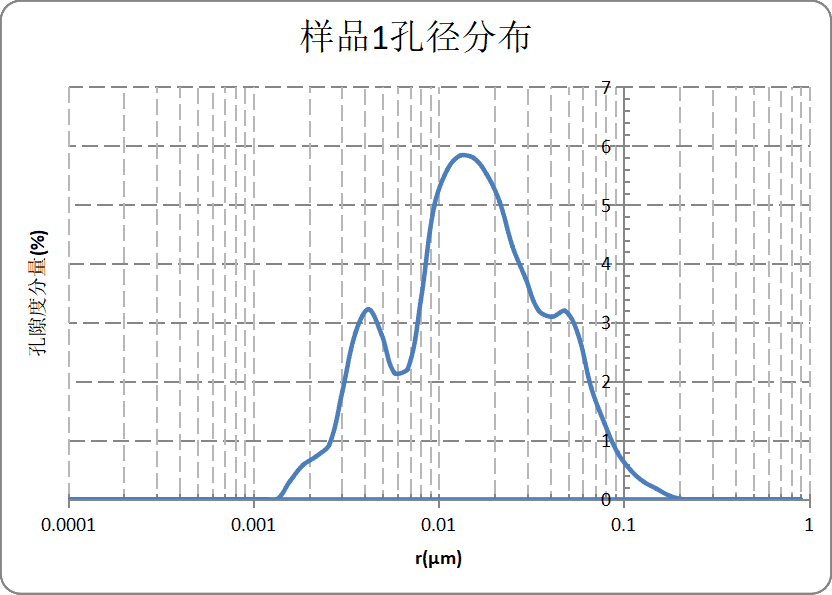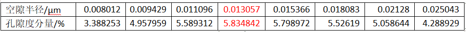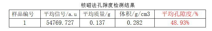 Using software modelling, the LF-NMR method fully presents the pore size distribution of the sample. The porosity is 48.93%, with the main distribution peak at 13 nm corresponding to a pore fraction of 5.83% (highlighted in red in the table above).
