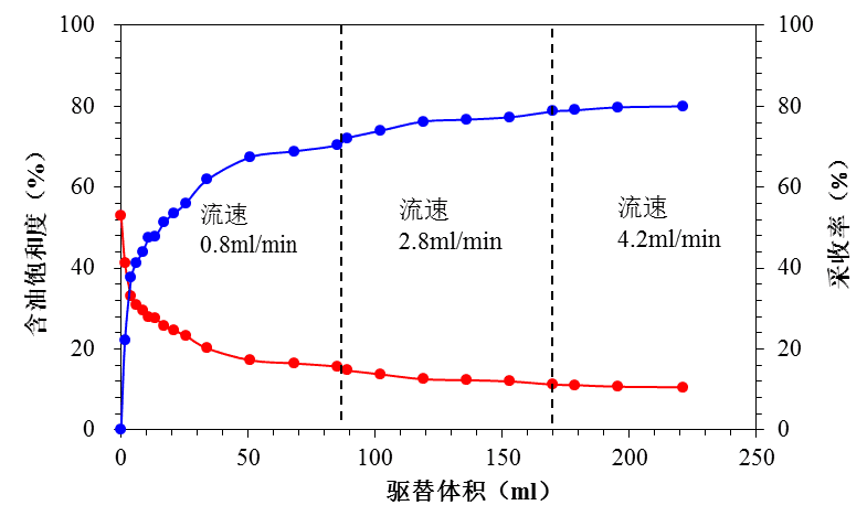 Following the first injection rate increase (from 0.8 ml/min to 2.8 ml/min), a significant improvement in recovery was observed near the ramp-up point, likely due to increased capillary number.