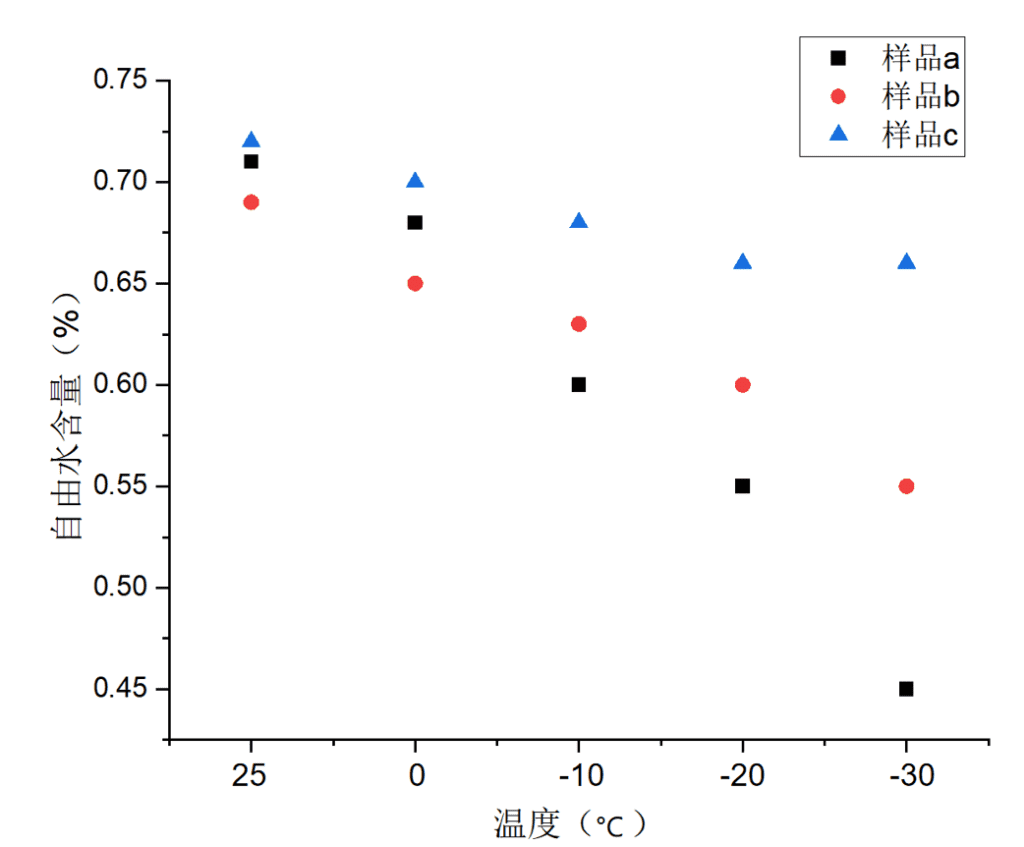 Changes in free water proportion determine the hydrogel’s ability to resist freezing. The smaller the change across different temperatures, the stronger the freeze resistance. According to the graph, sample c showed the least fluctuation in free water content, further confirming its enhanced anti-freezing performance relative to samples a and b.