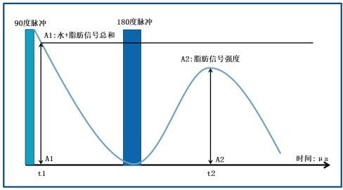 The diagram below illustrates the spin-echo sequence and corresponding NMR signal detection. After a 90° radiofrequency pulse, the Free Induction Decay (FID) signal is measured at time t1. The amplitude (A1) reflects the combined signal from both water and fat. Following a 180° pulse, the spin-echo signal amplitude (A2) is recorded, at which point the water signal has decayed to zero, leaving only the fat signal. By correlating signal intensity with fat content, precise quantification of fat in feed can be achieved.