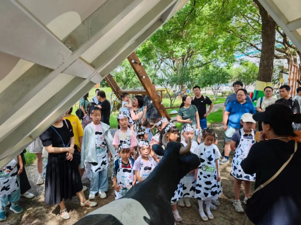 At the start of the event, the children, like cheerful little deer, arrived at the “eco-simulated farm” filled with a pastoral atmosphere. There, they opened their curious eyes, carefully listening to the staff explaining the different breeds of cows, learning about the habits of these “milk-producing champions.” Watching the simulated cows and listening to their stories, the children gained a more intuitive understanding of where milk comes from, their little heads filled with new knowledge.