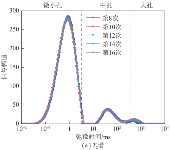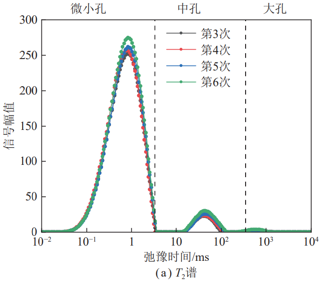 Through nuclear magnetic resonance testing of the coal samples subjected to vibration loads, the evolution characteristics of the pore fractures were analyzed. According to the T2 spectrum pore classification method, coal sample pores are divided into micropores (T2<3.33ms), mesopores (3.33ms≤T2<344ms), and macropores (344ms≤T2). Micropores are also called adsorption pores, while meso and macropores are collectively referred to as seepage pores. Based on the positions of the peaks in the T2 spectra, the evolution process of the coal pore structure under multiple vibration load impacts can be divided into four stages.