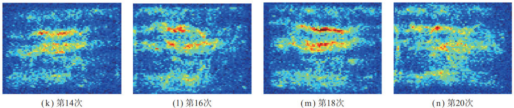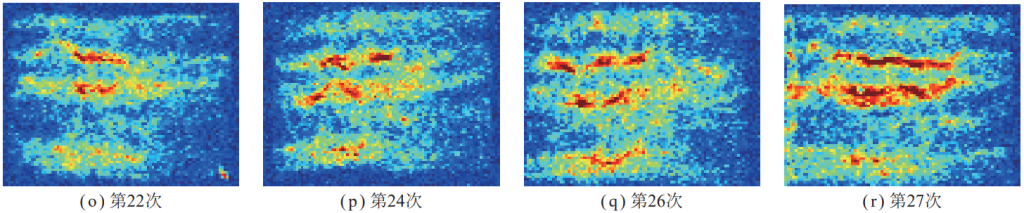Phase II: As the number of vibration load impacts increases, seepage pores begin to gradually increase. The signal response of the damage regions strengthens, and a trend toward a shift from dot-dispersed distribution to strip-concentrated distribution appears, as shown in Figure 9(d)–(g).