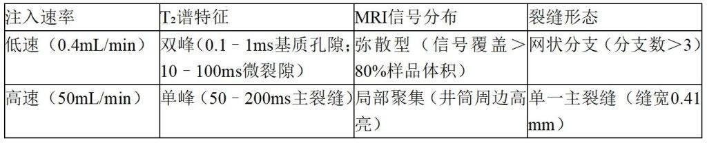Low Injection Rate: NMR signals indicate full-sample penetration (blue areas > 80% coverage); micro-CT confirms multi-branch fractures.