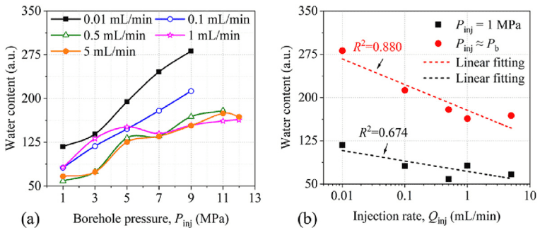 • Low rate zone (Qinj < 5 mL/min): Pb drops from 38.2 MPa to 27.3 MPa—a 28.6% reduction—due to hydration weakening the rock matrix.