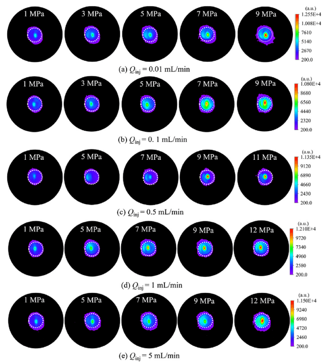 High Injection Rate: Fluid confined to central region (highlighted red zone); micro-CT reveals a single dominant fracture with width > 0.4 mm.