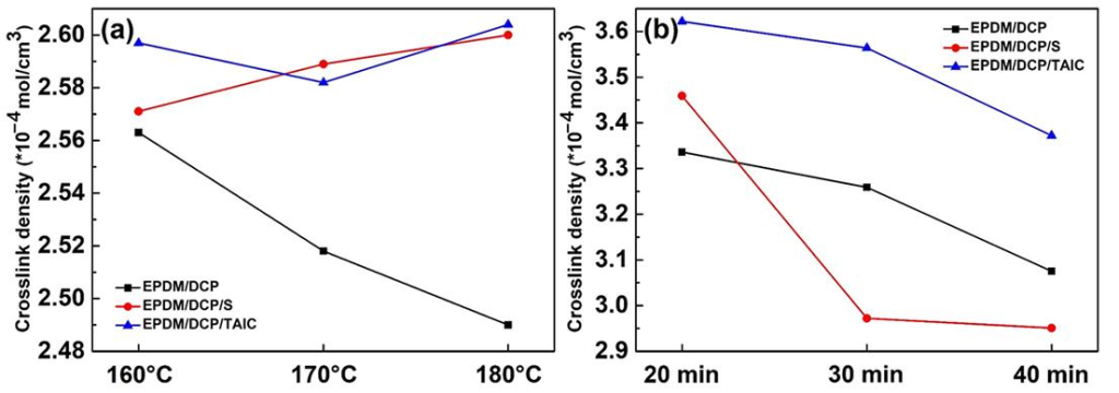 The effect of temperature, time, and curing agent type on the crosslinking density of EPDM rubber is shown in Figure 2. As shown in Figure 2a, as the temperature gradually increases, the crosslinking density of EPDM/DCP rubber decreases, while the crosslinking densities of EPDM/DCP/S and EPDM/DCP/TAIC remain at relatively reasonable values. One possible explanation is that the presence of curing auxiliaries like S and TAIC can introduce C-S or C-O bonds into the crosslinking system, thereby improving the integrity of the crosslinked structure. Additionally, under prolonged high-temperature conditions, C-S, C-C, and C-O bonds in EPDM rubber break, leading to a decrease in its crosslinking density. Therefore, the optimal curing temperature for EPDM rubber is 160°C. With an increase in time, the crosslinking density of EPDM rubber shows a continuous decreasing trend, with EPDM/DCP/S showing the fastest decrease (Figure 2b). The bond energies of C-S, C-C, and C-O are 276 kJ/mol, 334 kJ/mol, and 364 kJ/mol, respectively, with the C-S bond having the lowest bond energy. Under prolonged high-temperature conditions, the C-S bond is more easily broken than the others. The optimal curing time for EPDM rubber is 20 minutes. At 160°C for 20 minutes, the crosslinking densities of EPDM rubber reach 3.336, 3.459, and 3.622 × 10-4 mol/cm3, respectively. The crosslinking densities of EPDM/DCP/S and EPDM/DCP/TAIC are significantly higher than that of EPDM/DCP, indicating that the incorporation of S and TAIC promotes a higher crosslinking density of the rubber.